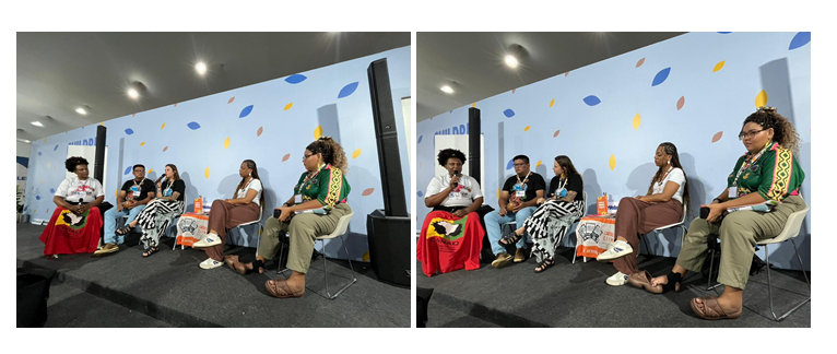 Na parte da tarde, a coordenadora nacional da CONAQ, Edna Paixão, levou as vozes quilombolas até a Zona Azul, durante o painel “Cartas de Direitos Climáticos: Território Tecendo Futuros Possíveis para Crianças e Jovens”. Em sua fala sobre “Fortalecimento da Juventude frente à Crise Climática através da Educação Quilombola”, Edna enfatizou que os jovens quilombolas enfrentam diretamente os impactos das mudanças climáticas e do racismo ambiental, que afeta desde a educação até as condições de vida nos territórios.