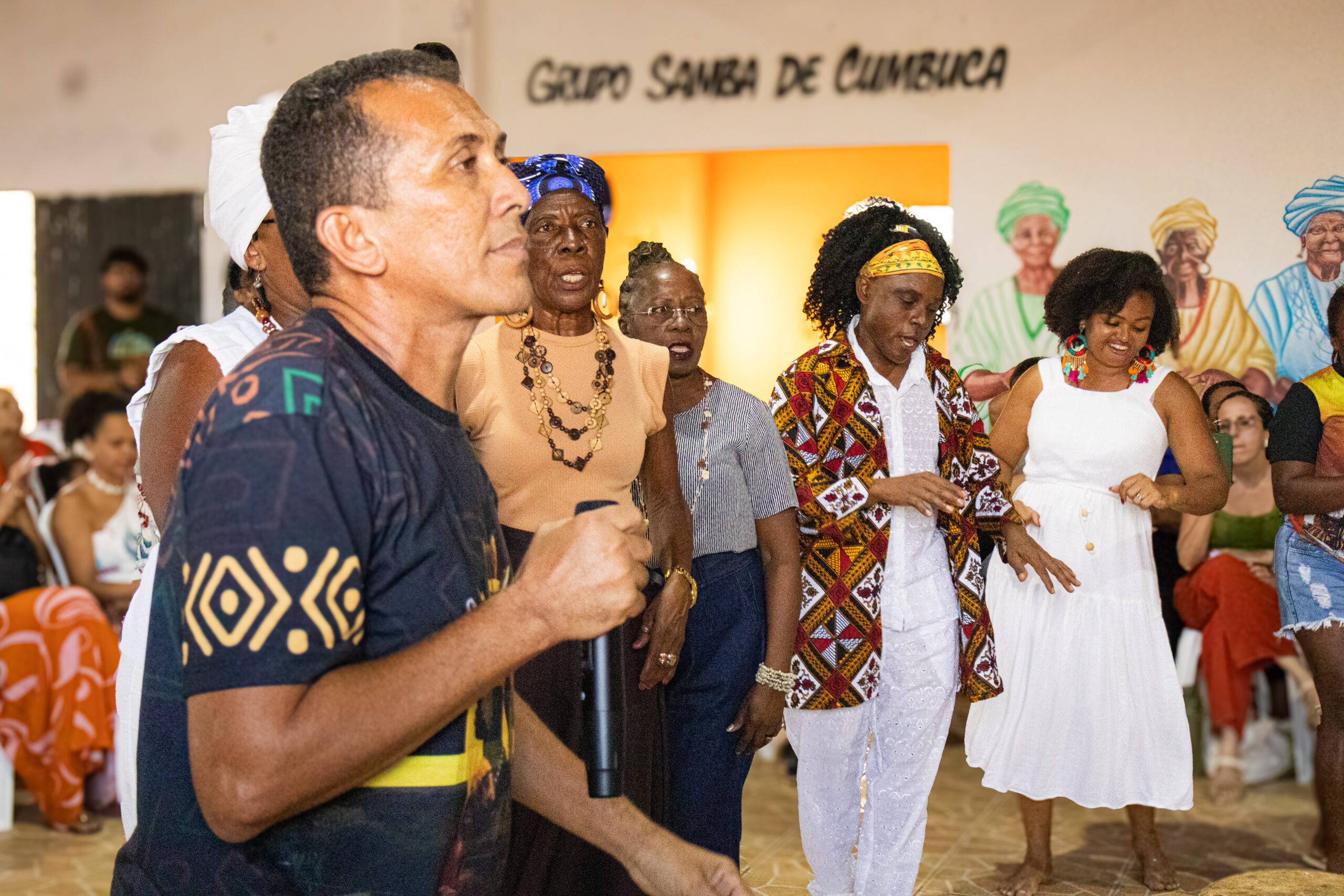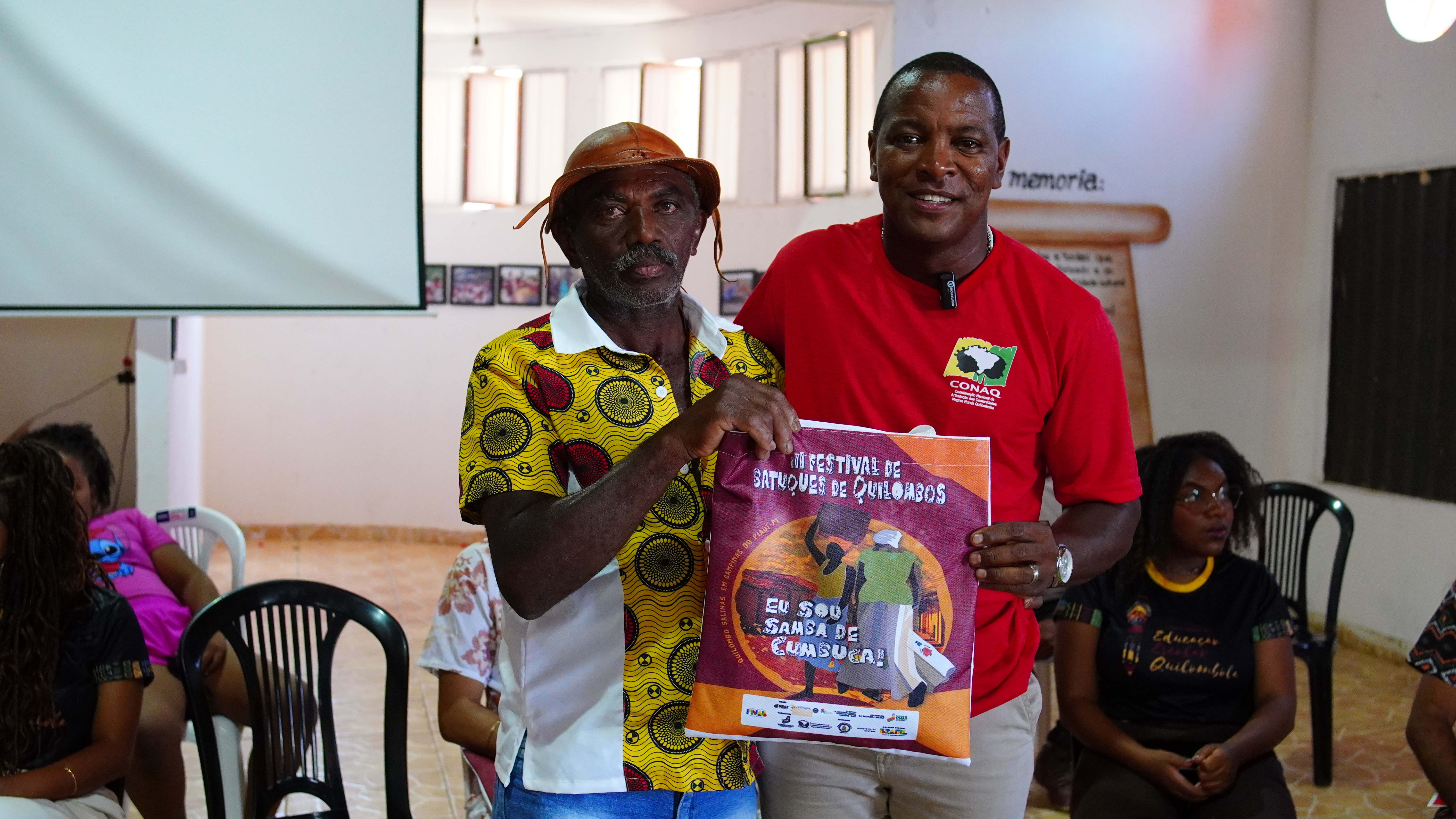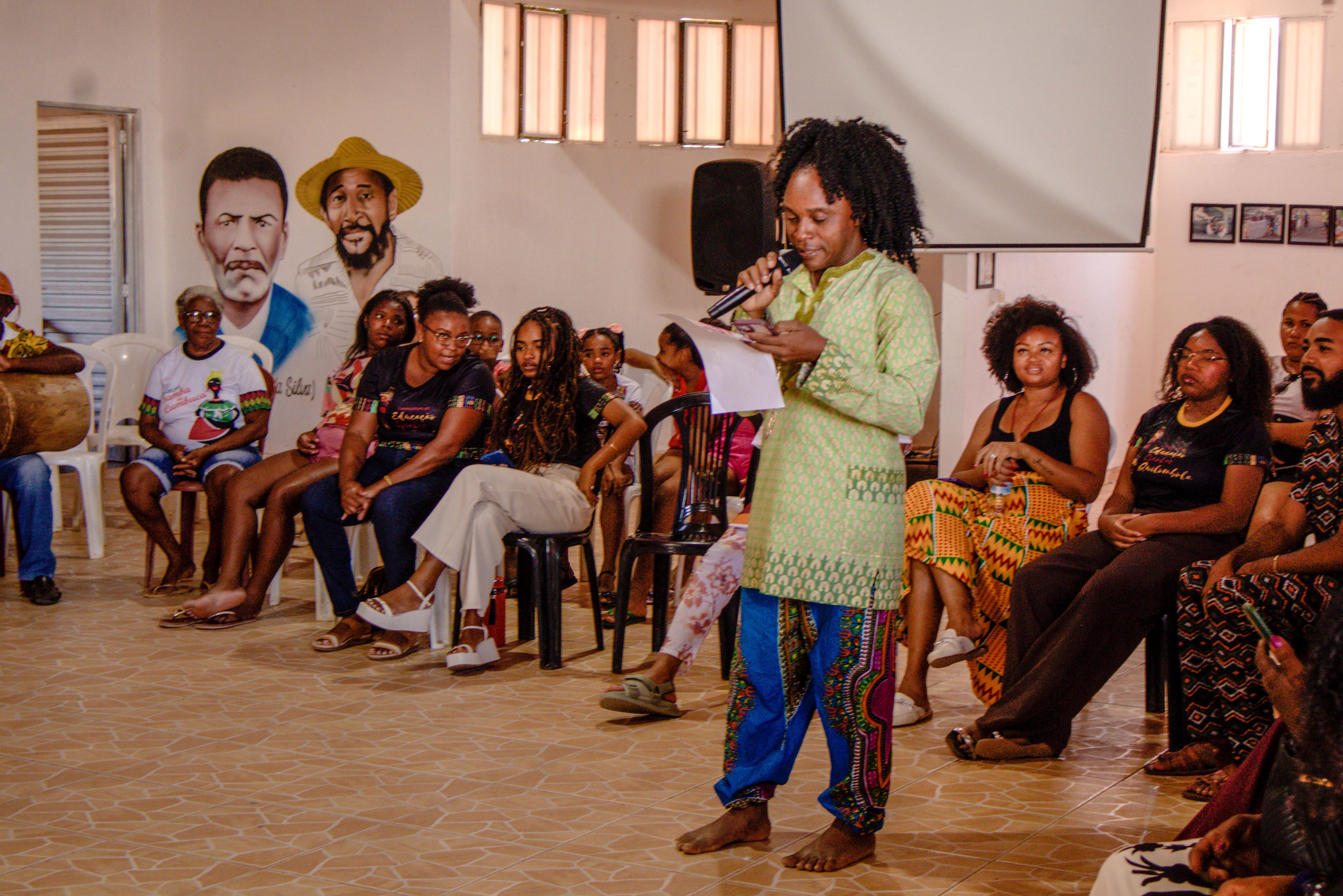 A programação também contou com a exibição de documentários. Os produtos audiovisuais com narrativas quilombolas registram memórias, mestres e experiências de resistência e o Samba de Cumbuca e Reizados Quilombolas da Comunidade Salinas.