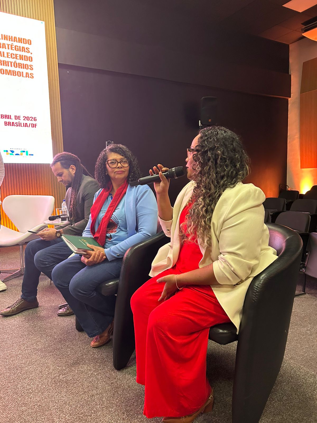 “Estar nesse espaço representando toda uma coletividade é algo muito importante e, ao mesmo tempo, muito desafiador para mim. Ser uma mulher preta quilombola em um espaço de decisão, e ainda mais como a primeira diretora de uma diretoria recém-criada, carrega uma série de responsabilidades que vão além do institucional. A minha trajetória até aqui é fruto de uma construção coletiva, da formação política que tive dentro da CONAQ, e isso orienta diretamente a forma como atuo. O mínimo que posso fazer é dar devolutiva ao meu povo a partir desse lugar que a própria organização me ajudou a construir. Tenho muita consciência do peso que é ocupar esse espaço, e por isso também busquei uma qualificação técnica que me permitisse atuar com responsabilidade e qualidade na gestão da política quilombola. O sentimento que me acompanha é de gratidão, à ancestralidade, ao sagrado e, principalmente, às mulheres que vieram antes de mim e abriram caminhos para que hoje eu pudesse estar aqui.”
